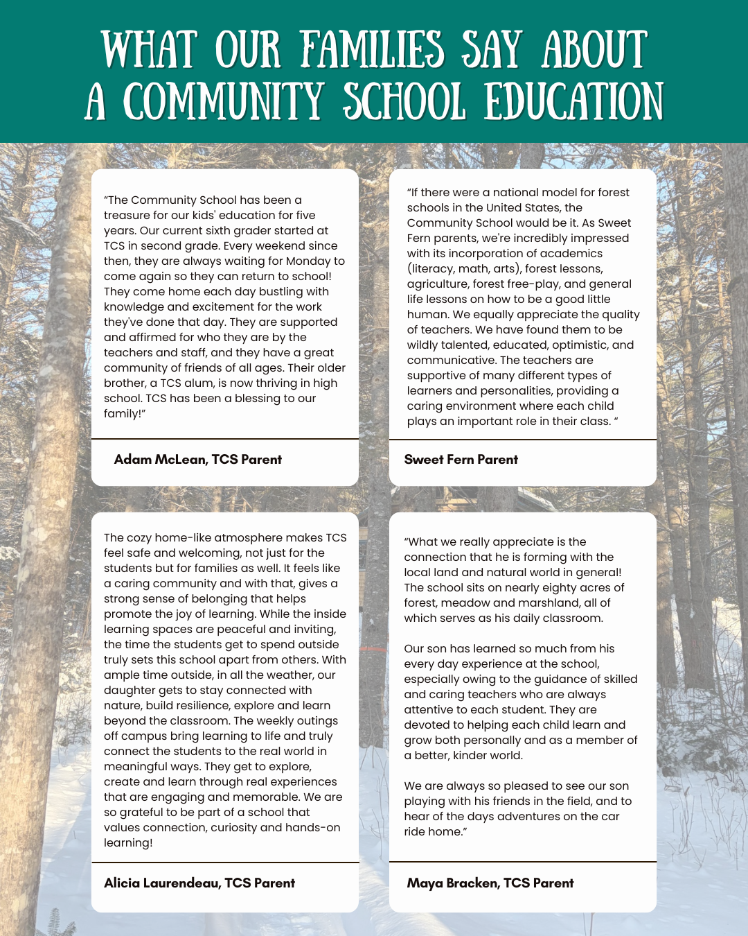 The Community School (TCS) is an independent, Place-based Forest Kindergarten, Elementary and Middle School, cultivating a sense of self, place and community, located on an 80 acre campus in the heart of Mount Desert Island on the coast of Maine.